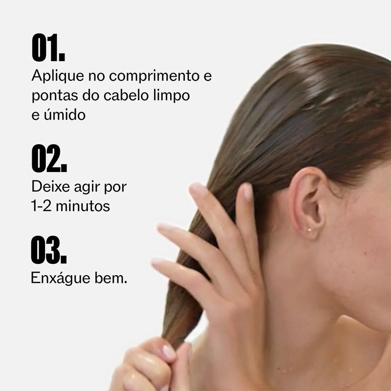 Aplique o condicionador no cabelo limpo e úmido, pelo comprimento e pontas. Deixe agir por alguns instantes e, em seguida, enxágue bem.